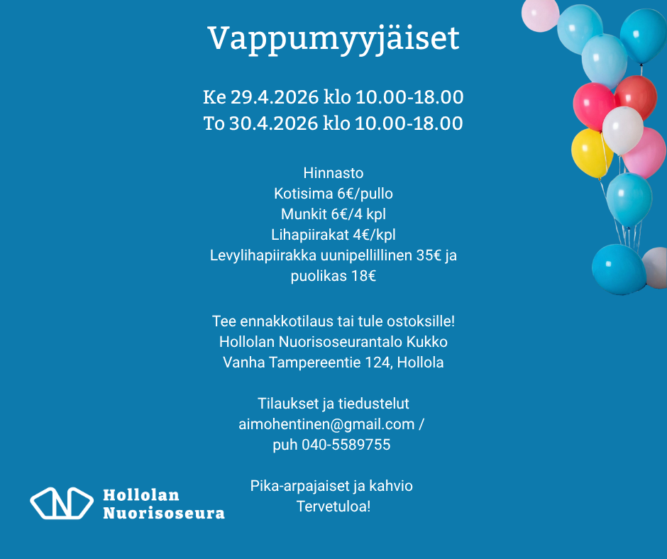 Sunnuntaina 10.5.2026 klo 13.00–15.00 Hollolan Nuorisoseurantalo Kukko, Vanha Tampereentie 124, Hollola Esityksiä luvassa muun muassa Trio Liljankukalta, Hollolan Nuorisoseuran kansantanssijoilta,…